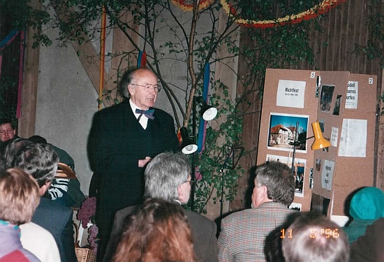 Das Bild zeigt Kurt Eisenmeier am 11. Mai 1996. An diesem Tag hielt er aus Anlass der Einweihungsfeier des ersten Wohnhauses einen Festvortrag mit dem Titel "Dörfliche Lebensgemeinschaft - Impuls für eine neue Form des Zusammenlebens"