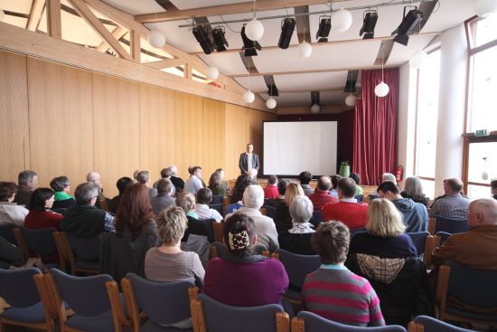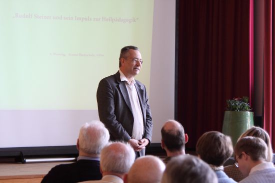 Professor Dr. Warning von der Alanus Hochschule hielt den Einführungsvortrag. Er arbeitete, neben einigen medizinischen Einblicken in die anthroposophisch orientierte Heilpädagogik, die Berührungspunkte im Leben Rudolf Steiners mit seelenpflegebedürftigen Menschen heraus. Diese gab es von frühester Jugend an. Der Bruder von Rudolf Steiner war taubstumm. Mit 23 Jahren kommt Rudolf Steiner als Hauslehrer zu der Familie Specht, und übernimmt die Erziehung der vier Söhne, unter denen sich ein Sorgenkind befindet. Otto Specht hat einen Hydrozephalus und gilt als Bildungsunfähig. Diese Aufgabe wird für R. Steiner zum eigentlichen Studium der Physiologie und Psychologie. Für eine halbe Stunde Unterricht muss er sich zwei Stunden vorbereiten, und er erkennt wie Erziehung und Unterricht zu einer Kunst werden müssen. Nach zwei Jahren hat Otto Specht die Volksschulbildung nachgeholt, er besteht die Reifeprüfung für das Gymnasium, macht später Abitur und wird später Arzt. In Rudolf Steiners letzten Lebensjahr, als die drei späteren Heilpädagogen, Strohstein, Pickert und Löffler, mit der Frage nach der Heilpädagogik an Steiner herantreten, kommt das in der Erziehung von Otto Sprecht erarbeitete zum Tragen. Steiners Besuch auf dem Lauenstein, und der vom 25.6. – 7.7.1924 vor Ärzten und Heilpädagogen in Dornach gehaltene Kurs, werden zur Geburtsstunde der anthroposophisch orientierten Heilpädagogik. Geradezu spielerisch hat Professor Dr. Warning neben Steiners Biographie fast alle Grundprinzipien der Anthroposophie angesprochen, gepaart mit einigen humoristischen Einlagen, ein wirklich gelungener Beitrag.