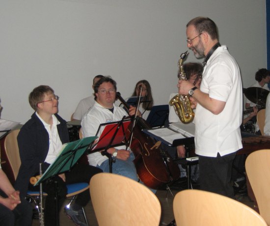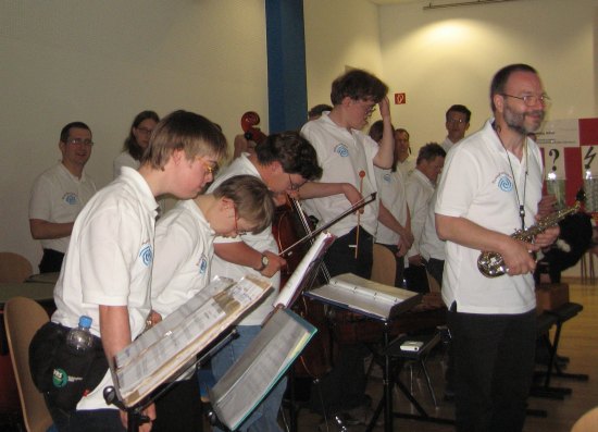 Im Anschluss an zwei Fachvorträge, die zum Nachteil der Musiker eher weniger in "einfacher Sprache" gehalten worden sind, hat Hr. Seehausen mit einer kleineren Gruppe (ca. 10 Musiker) noch zwei Workshops angeboten. Interessierte durften sich dabei mitten in das Orchester begeben z.B. an die Pauken, um einmal auf "Augenhöhe" miteinander zu musizieren. Je Workshop sind auf diese Weise zwei neue Stücke ("If you`re happy"u.a.) so geprobt worden, dass sie nach einigen Durchläufen bereits gespielt werden konnten. Eine der Teilnehmerinnen aus dem 1. Workshop ist spontan so begeistert gewesen, dass sie auf ihrer Digitalkamera einen kleinen Film gedreht hat, den Sie an Kolleginnen u. natürlich auch an Hr. Seehausen weiterleiten möchte. Dieses gemeinsame Musik machen hat den Mitwirkenden sichtlich Spaß gemacht und dabei den Fach-Teilnehmern eine neue Perspektive auf die differenzierte Zusammenarbeit im Orchester des Eichhofs ermöglicht (siehe z.B. einige "Regieanweisungen" seitens Hr. Seehausen per Ganzkörpereinsatz). Jeder ist auf diese Weise da ermutigt und angeleitet worden, wo er es gebraucht hat - auch wir z.B. am Xylophon nach über 40 Jahren wieder das 1. Mal...
