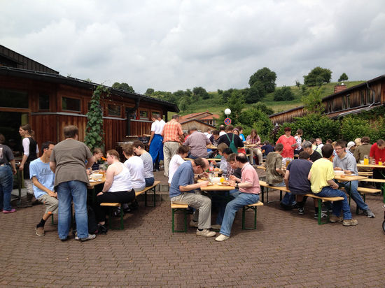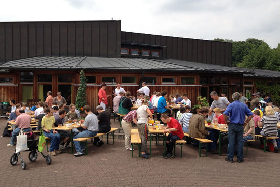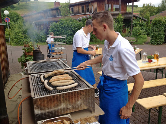 Ab Morgen ist die Werkstatt des Eichhofs geschlossen. Zwei Wochen lang machen die Mitarbeiterinnen und Mitarbeiter nun Pause. Viele fahren in den Urlaub, aber es gibt auch viele, die die (nun viel ruhigere) Zeit auf dem Eichhof genießen. Als schönen Abschluß der Arbeit hatten Tatjana Taige, Leiterin der Hauswirtschaft, und Köchin Gaby Wendzioch mit ihren Mitarbeiterinnen und Mitarbeitern etwas besonderes vorbereitet. Statt des üblichen Mittagessen gab es einen leckeren Nudelsalat und frisch gegrillte Bratwürste.