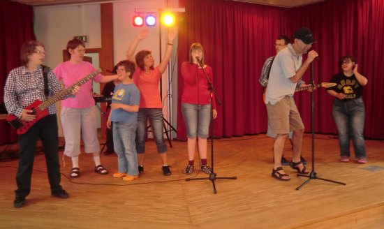 Nachdem es 2011 zum ersten Mal stattfand und seitdem immer wieder vielfach gefordert wurde, suchten wir heute erneut den Superstar auf dem Eichhof. Zum Gesucht-Werden stellten sich Kandidaten der Häuser 1-3,7 und 8 zur Verfügung. Von 10.00h bis 13.00h wurden Songs gesucht und geprobt, Bühnenshow einstudiert und viel gelacht. Viele stellten fest: Playback-singen und –spielen ist gar nicht so einfach…..aber schöööööööön. Wir fühlten uns viiieel besser als bei RTL. Manche gaben den Solo-Künstler, andere wiederum wollten eine Begleitband mit auf der Bühne haben. So wechselten die Teilnehmer sich in wechselnden Band-Besetzungen on stage ab, so kam jeder mehrfach auf die Bühne und an die verschiedenen Instrumente, welche zwei der Musiker von SIXT´n OTTEN gestellt hatten, die am 02.06.2012 an gleicher Stelle mit IMOHAR das HdB rockten. Nach der Mittagspause klärten wir für jeden Künstler dessen „Stagedress“ (Bühnenkleidung) und probten nochmal die Songs sowie das gemeinsame Abschlusslied. Um 17.15h war es soweit: die Vorführung vor dem Auditorium , welches ähnlich zahllos erschienen war wie 2011, begann……und nachdem alle gesungen hatten, stieg die Spannung spürbar……mehr und mehr…….WER würde der Sieger sein?