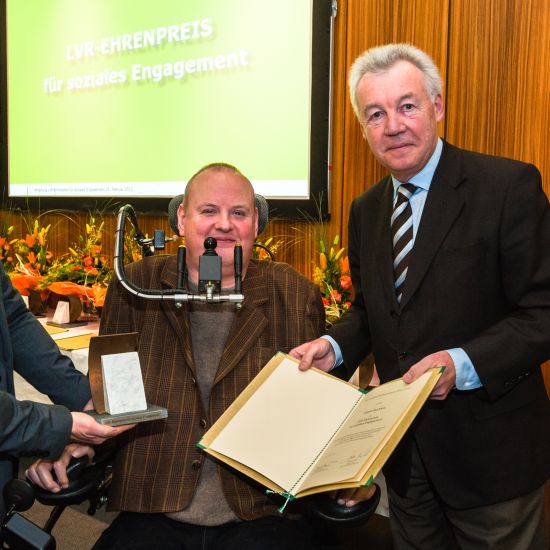 Jürgen Wilhelm, der Vorsitzende der Landschaftsversammlung Rheinland, betonte in seiner Ansprache: „Sie kennen die Probleme, mit denen Menschen mit Behinderung täglich konfrontiert sind. Ihre Erfahrungen und Kompetenzen bringen Sie ein in die Unterstützung und Beratung anderer. Für Ihr Engagement für Menschen mit Handicap möchte der Landschaftsverband Rheinland sich bei Ihnen ganz herzlich bedanken." Als Ausdruck des Dankes und der Anerkennung für diesen Einsatz erhält Jürgen Buchholz den LVR-Ehrenpreis für soziales Engagement. Als äußeres Zeichen für diese Ehrung überreichte Wilhelm ihm die aus Marmor und Stahl geschaffene Plastik „Die Welle" von der Bonner Künstlerin Petra Siering.