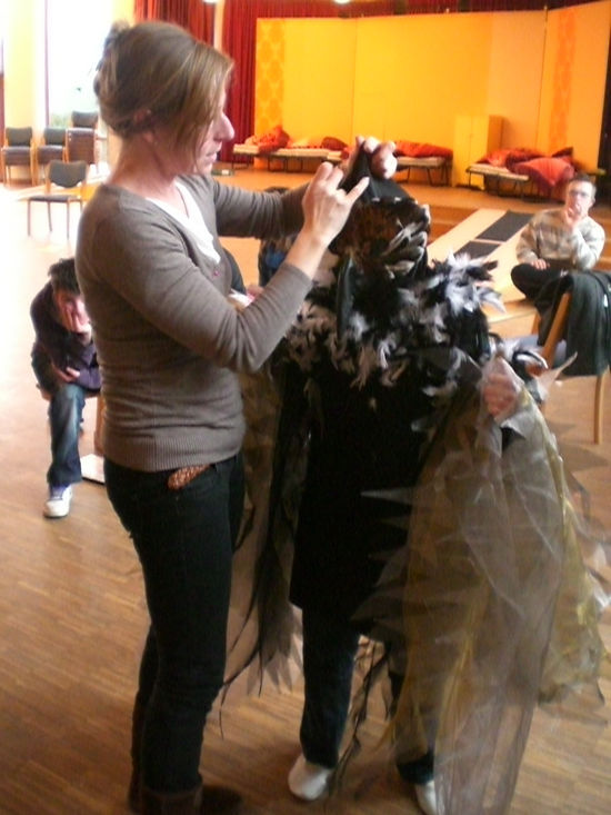 Nicht nur, dass das traumhafte Bühnenbild unsere Proben nun antreibt und visuell bereichert, auch hatten wir nun unsere erste Kostümprobe mit wirklich kunstvoll gefertigten Kostümen. Da unser Stück in zwei Welten spielt (basierend auf dem Märchen “Die zertanzten Schuhe“ der Gebrüder Grimm), gibt es sowohl moderne Kostüme und dementsprechend auch ein neuzeitlich eingerichtetes Mädchenzimmer. Im Gegensatz dazu aber auch märchenhaft-phantastische Kostüme, in denen die Spielenden unter anderem durch einen mystischen Marmorpalast tanzen.