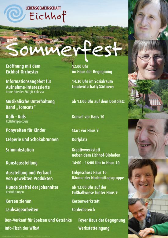 Eröffnet wird das Fest - das ist mittlerweile Tradition - um 12 Uhr, am Sonntag, 23.Juni, mit einem kleinen Konzert des Eichhof-Orchesters im Haus der Begegnung. Hier gibt es gleich im Anschluss auch etwas Leckeres zu essen, später gibt es Kaffee und Kuchen. Auf dem gesamten Gelände sind etliche Attraktionen vorbereitet, vom Rollstuhlparcours über eine Kunstaustellung, Ponyreiten bis hin zum Verkauf von schönen Produkten aus dem Werkstattbereich des Eichhofs. Eine ausführliche Darstellung aller Attraktionen finden Sie auf der Grafik unten.