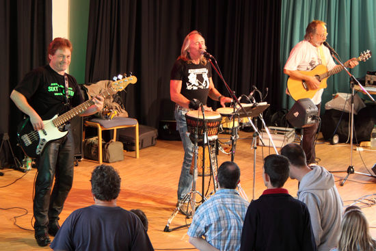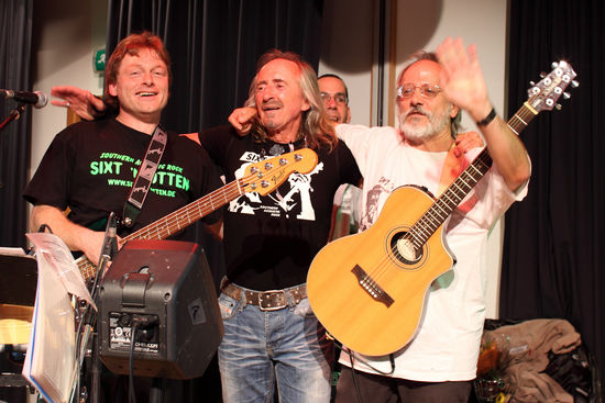 Schon seit Jahren tritt die Band "Sixt'n Otten" regelmäßig auf dem Eichhof auf. Die Band, mit der auch regelmäßig Eichhof-Mitarbeiter Reinhard Jung musiziert hat, gab beliebte Konzerte mit Cover-Musik von Rock-Musik-Stücken der vergangenen Jahrzehnte. Nun löste sich die Band auf und es ergab sich, dass das allerletzte Konzert im Haus der Begegnung stattfand. Zunächst - wie auch schon bei Veranstaltungen zuvor - trat die Bonner Grupppe "Imohar" mit verführerischen orientalischen Tanz auf, anschließend gab es Rock vom Feinsten. Die Bewohner bedankten sich mit Umarmungen und langanhaltendem Applaus für dieses und auch für die vielen vorigen Konzerte.