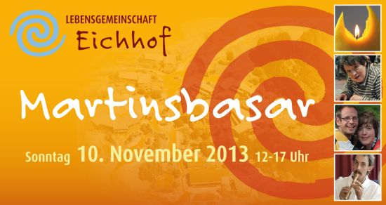 Schon mal vormerken: Der Martinsbasar der Lebensgemeinschaft Eichhof findet in diesem Jahr am Sonntag, 10.November von 12 bis 17 Uhr statt. Die Vorbereitungen laufen auf Hochtouren, das Programm wird in Kürze per Newsletter verschickt.