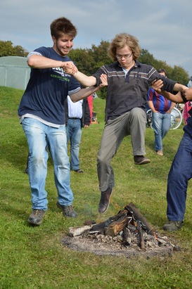 Der Mut stand am 30.September auf dem Eichhof wieder im Vordergrund. Jeder konnte seinen Mut beim Sprung über das Feuer, den Kampf gegen den feuerspeienden Drachen und beim balancieren über eine Balken erproben. Neben der Kraftprobe beim Tauziehen, galt es auch sich beim Geländelauf mit verbundenen Augen, dem Gang in eine dunkle Höhle oder beim Tasten in unterschiedliche Materialien zu überwinden. Zwischen den einzelnen Mutproben konnte sich jeder an der Getränkebar stärken. Zum Glück waren alle Teilnehmer/innen gut vorbereitet. Denn zuvor hatten sich alle mit Mutliedern und der Geschichte des heiligen Michael eingestimmt.