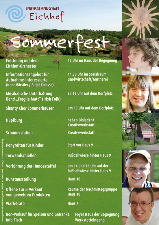 Das Sommerfest am Sonntag, 29.Juni, wird schon seit Monaten vorbereitet - jetzt steht das ganze Programm und es ist wieder riesig geworden. Traditionell wird es um 12:00 Uhr mit einem Konzert des Eichhof-Orchesters eröffnet. Danach gibt es bis 17:00 Uhr eine Vielzahl von Programmpunkten, die Sie im Bild unten finden.