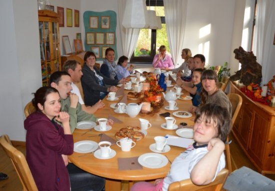 Am Mittwoch den 15.10. hatte sich besonderer Besuch auf dem Eichhof angekündigt. Die ehemaligen Besitzer des Hofes, Familie Felten (Frau Felten, ihre Tochter Frau Felten-Klemmer und deren beide Kinder), wollten sich ihr ehemaliges Wohnhaus anschauen. Pünktlich um 16:30 Uhr erschien Georg Rothmann mit den Gästen. Die Bewohner des Hauses waren schon sehr aufgeregt. Doch bevor zu der Besichtigung aufgebrochen wurde, stärkte man sich erst einmal an der, von einer Betreuerin liebevoll gedeckten Kaffeetafel. Bei Kaffee und Teilchen wurde viel erzählt. Björn Hanika konnte viele Geschichten über die Renovierung des Hauses berichten und wusste noch die Namen der Pferde, die Familie Felten damals besaß.