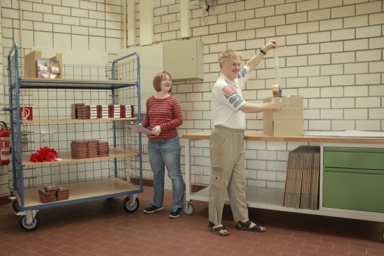 Die Kerzenwerkstatt möchte eine neue Arbeitsgruppe vorstellen. Eine Versandtgruppe. Wie Ihr auf dem Foto sehen könnt, haben wir einen wunderbaren großen Verpackungstisch auf vier Rädern mit einer großen Arbeitsfläche für das Paketepacken. Dann haben wir zusätzlich ein fahrbahres Regal, wo wir unsere Aufträge zusammenstellen können. Anna-Maria Sommer und Oliver Gerhardt haben das erste Team gebildet.