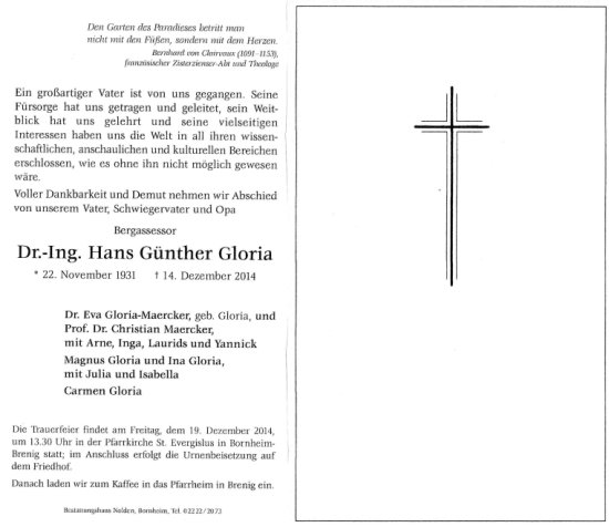 - Abschied: Dr. Hans Günther Gloria ist tot