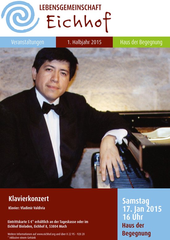 Zu einem Konzert mit dem Pianisten Vladimir Valdivia lädt der Eichhof für Samstag, 17.Januar, ab 16:00 Uhr ins Haus der Begegnung ein. Valdivia ist 1970 in Lima/Peru geboren und kam 1989 nach Deutschland. Hier wurde er in die Meisterklasse von Prof. Ludwig Hoffmann an der Münchner Musikhochschule aufgenommen. 1990 gewann er ein Stipendium des Deutschen Akademischen Austauschdienstes. 1991 ging er bei einen Wettbewerb für Rundfunkaufnahmen des Bayerischen Rundfunks und Hessischen Rundfunks als Sieger hervor.