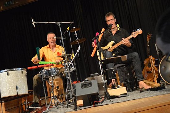 Und so war es dann auch: Peter Funda überzeugte neben Gesang, Percussion aller Art, Akkordeon, Ukulele, Schlitztrommel und Glockenspiel. Wolfram Cramer von Clausbruch begeisterte die Zuschauer neben seinem Gesang an Gitarre, Bass, Percussion, Hang, Kazoo, Ukulele, Harfe.