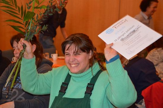 Ihr zehnjähriges Betriebsjubiläum konnten in diesem Jahr insgesamt 26 Mitarbeiter des Eichhofs feiern. 18 betreuten Werkstattbeschäftigten und acht hauptamtlichen Mitarbeitern aus den Bereichen Werkstatt und Wohnen wurde mit Urkunden und Blumen gedankt: Kiran Afzal, Stephan Bamberg, Maik Becker, Dennis Corten, Janina Demes, Petra Fischer, Anne Katrin Heidenreich, Margarete Groß, Michael Heimann, Laura Henscheid, Melanie Höller, Klaus Kanonenberg, Bianca Kasper, Malte Lemppenau, Constantin von Lepel, Carolin Marcus, Alexander Raasch, Julia Reppermund, Mariehelen Schöllmann, Bastian Schürmann, Linda Schwertfeger, Severin Steinmeier, André Stoquart, Joana Tannhäuser, Sara Ulm und Gerlinde Wulfert.
