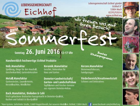 Unser alljährliches Sommerfest findet in diesem Jahr am Sonntag, 26.Juni, statt. Es wird traditionell um 12:00 Uhr mit einem Vortrag des Eichhof-Orchesters eröffnet. Die Manufakturen präsentieren ihre schönen Handwerksprodukte in der Werkstatt. Auf dem Dorfplatz und im Haus der Begegnung wird für das leibliche Wohl gesorgt. Das Programm des Tages finden Sie hier: