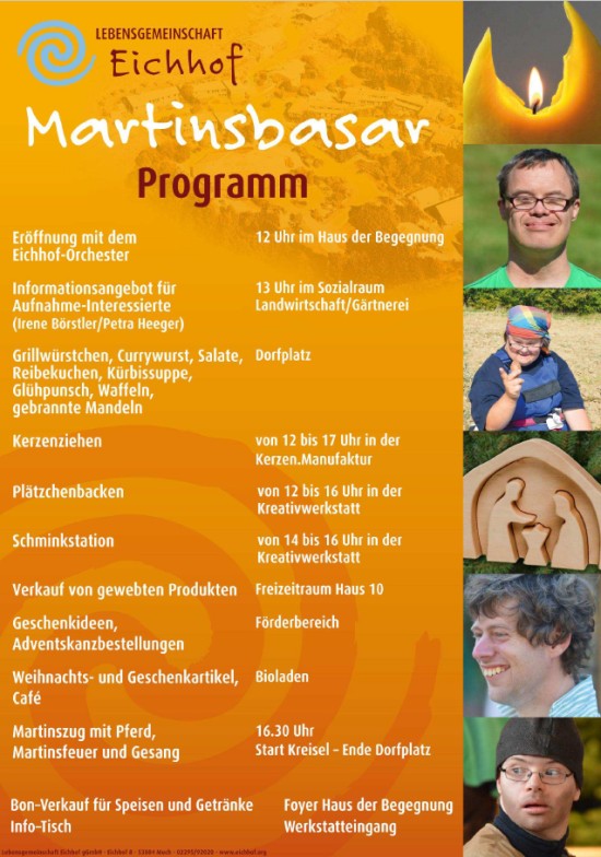 Am Sonntag, 6.November, begrüßen wir die Freunde des Eichhofs wieder zum Martinsbasar. Die Manufaktur-Bereiche bieten in ihren Werkstätten Spielwaren, Krippen, Geschenkartikel, Kerzen, Adventskränze und vieles mehr auf zum Verkauf an. Hier findet man wunderbare Weihnachtsgeschenke.