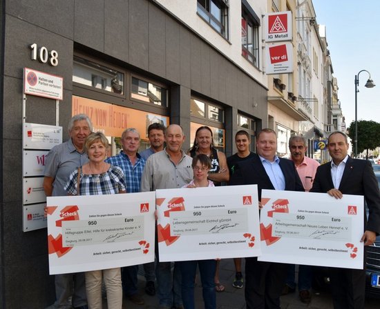 Über eine Spende freuen wir uns: Die IG-Metall hat eine Beschäftigtenbefragung im Sommer organisiert, daran beteiligten sich in der Region 3800 Menschen. Positiver Nebeneffekt dieser Befragung war die Ausschüttung von einem Euro je ausgefülltem Fragenbogen für soziale und kariative Zwecke. Im Anschluss an die Sitzung des Ortsvorstandes der IG-Metall Bonn-Rhein-Sieg erhielten vier Vereine der Region jeweils einen Scheck in Höhe von 950,-- € für ihre sozialen Projekte.