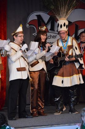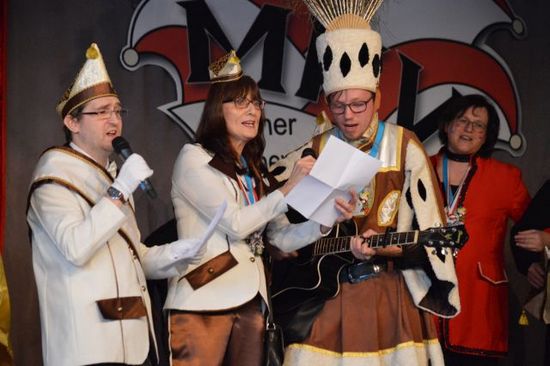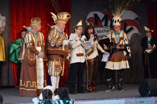 Am nächsten Tag schloss sich das Prinzentreffen in der Mucher Sülzberghalle an. Viele Jecken aus Much und Umgebung haben uns jubelnd empfangen wie auch Bürgermeister Norbert Büscher und Landrätin Notburga Kunert. Die Halle war gefüllt und wir freuten uns über die Begrüßung unserer Freunde des Mucher Karnevalvereins (MKV), die auch Veranstalter dieses Prinzentreffens waren und uns schon sehnsüchtig erwartet hatten. Zusammen mit unserer Tanzgruppe traten die Eichhof-Tollitäten mit ihrem Gefolge auf. Das Dreigestirn mit seinem Sessionsmotto „Loss de Sonn eren“ präsentierte sich. Wir haben die Bühne gerockt und die Mucher Karnevalsjecken zum Toben gebracht. Mit Freude und Bützje haben wir unsere diesjährigen Sessionsorden an die Repräsentanten des MKV verteilt und freuen uns auf ein Wiedersehen.