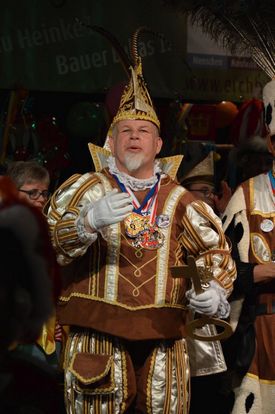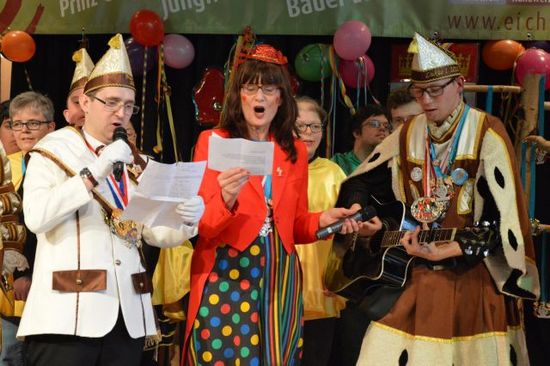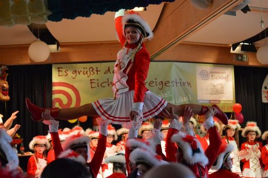 Der Höhepunkt der karnevalistischen Termine ist sicherlich die große Feier an Weiberfastnacht im „Haus der Begegnung“. Um 14:11 Uhr zog das Dreigestirn, begleitet durch die KAZI Funken „Rut-Wiess“ aus Lohmar, in den Saal ein. Danach folgten Schlag auf Schlag Auftritte unter anderem der Eichhof-Tanzgruppe, des Tanzcorps der Ehrengarde Siegburg und der Roten Funken der KG Schladern. Der Mucher Karnevalsverein brachte neben seiner Tanzgarde noch die Grashüpfer der Jugendtanzgarde und der Bambinis mit. Paul Radau sorgte dafür, dass der ganze Saal zu bekannten kölschen Liedern mitsang. Annette Brittner und Tim Hirschmann führten humorvoll und mit Freude durch das Programm. Unterstützt von Claudia Steimel hatten sie wieder ein tolles Programm zusammengestellt. Aber auch mit einem eigen Auftritt bereicherte das Dreigestirn das Bühnenprogramm. Prinzenführer Tim Hirschmann hatte dafür den „Stammbaum“ der Bläck Fööss auf den Eichhof, Much und das Bröltal umgedichtet. Bauer Lukas I. spielte dazu die Gitarre und das Dreigestirn mit Gefolge sang dazu. Bereits nach wenigen Takten stimmte der ganze Saal mit ein. Wir freuen uns über die Besuche der vielen Karnevalsgesellschaften aus der Region. Durch die gegenseitigen Auftritte und den Begegnungen bei unterschiedlichen Veranstaltungen sind Freundschaften entstanden.