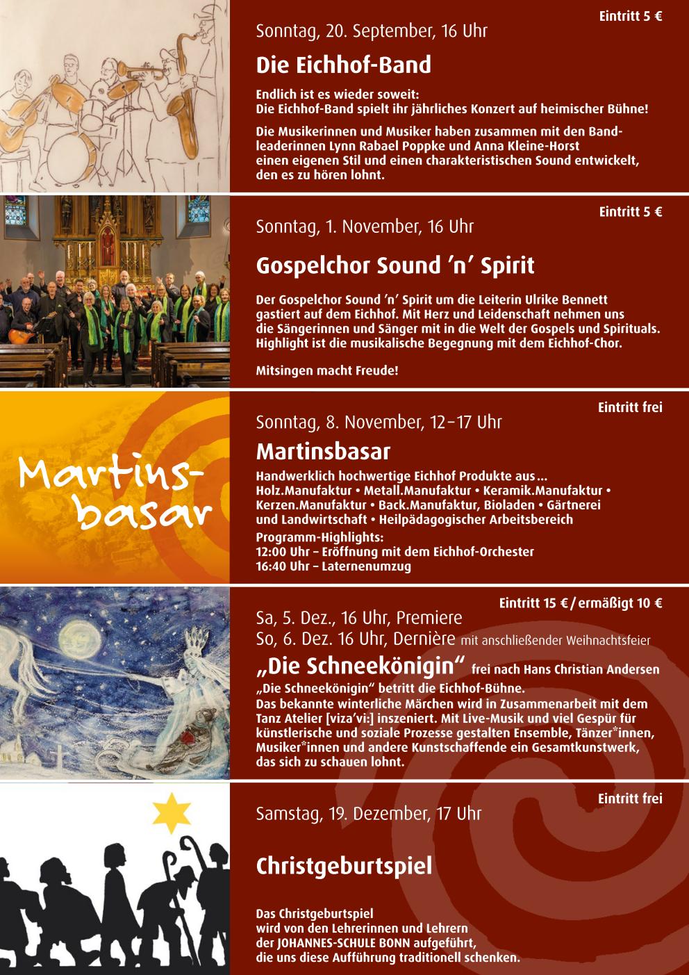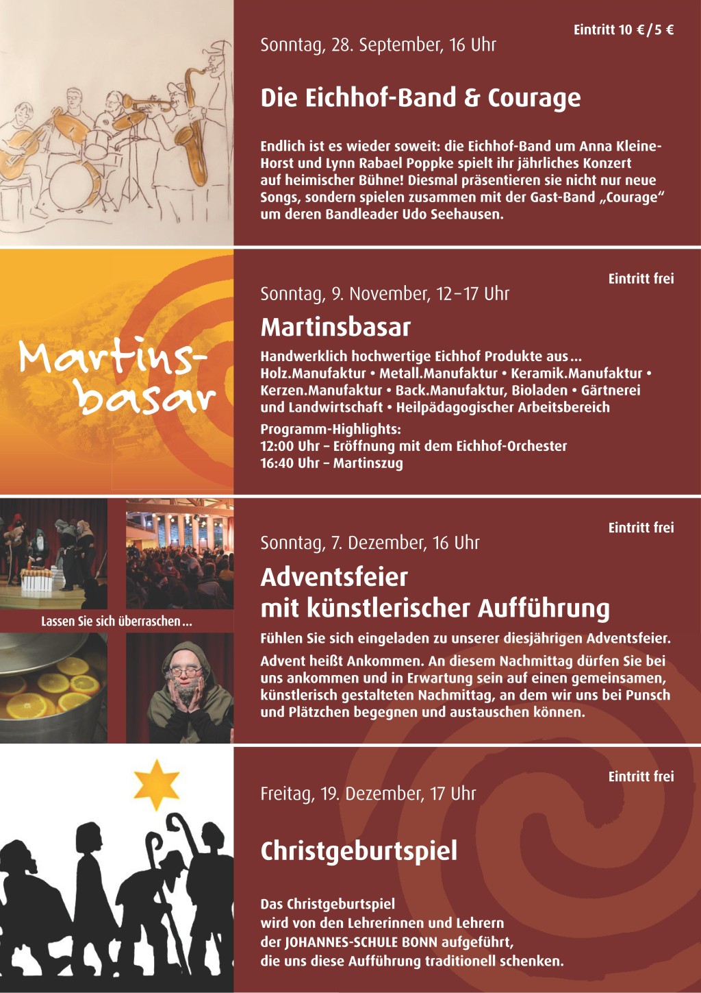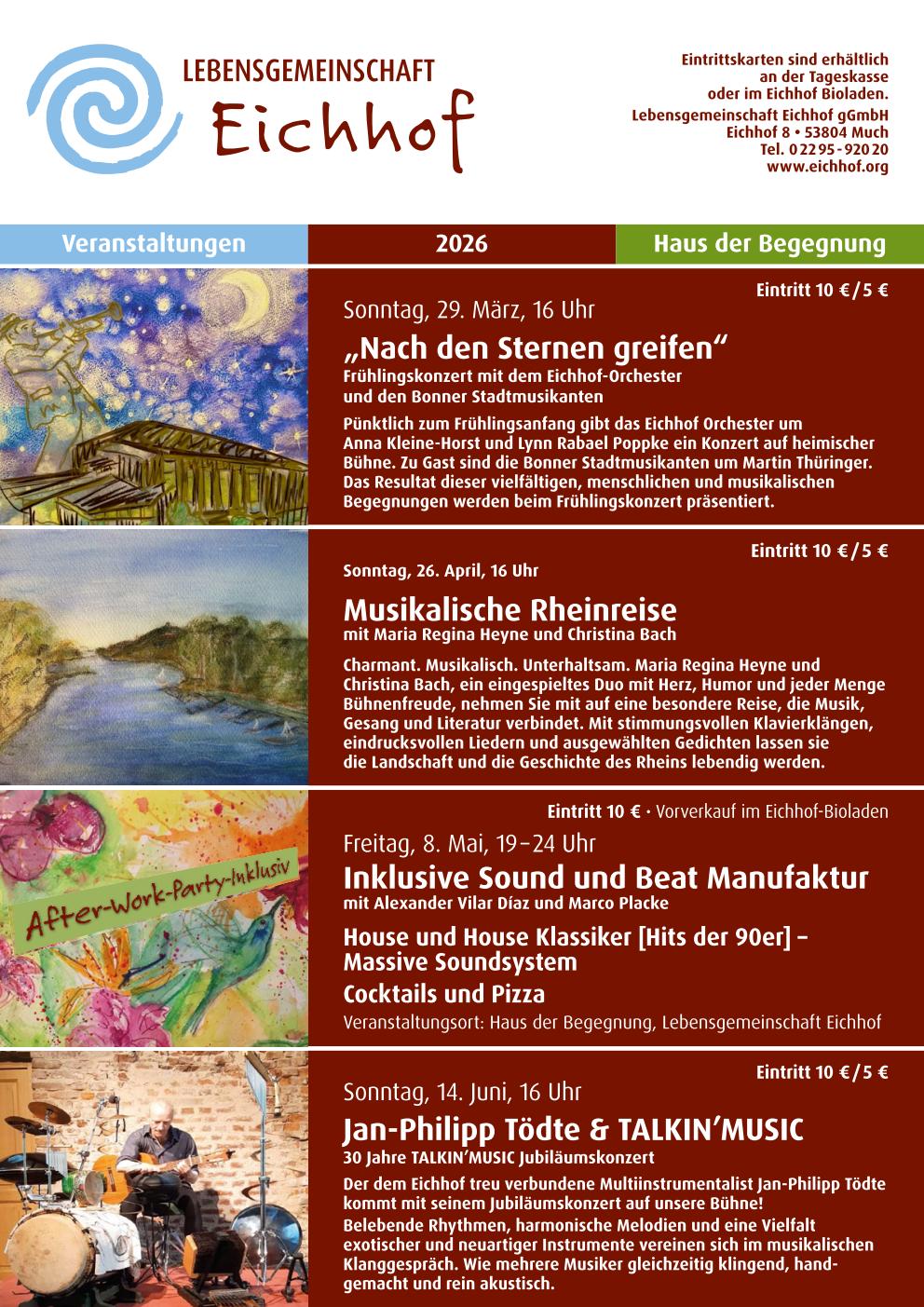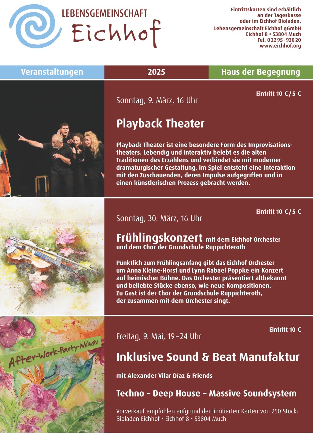 Veranstaltungen der Lebensgemeinschaft Eichhof gGmbH im Haus der Haus der Begegnung: Tickets für kostenpflichtige Veranstaltungen erhalten Sie bei den Vorverkaufsstellen oder an der Konzertkasse.